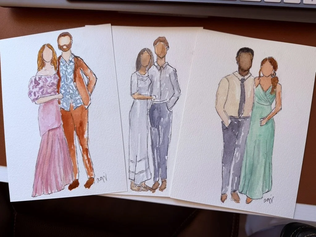Each portrait is completed in a loose, faceless, impressionistic watercolor style. The number of portraits completed on site varies based on guest flow and participation.